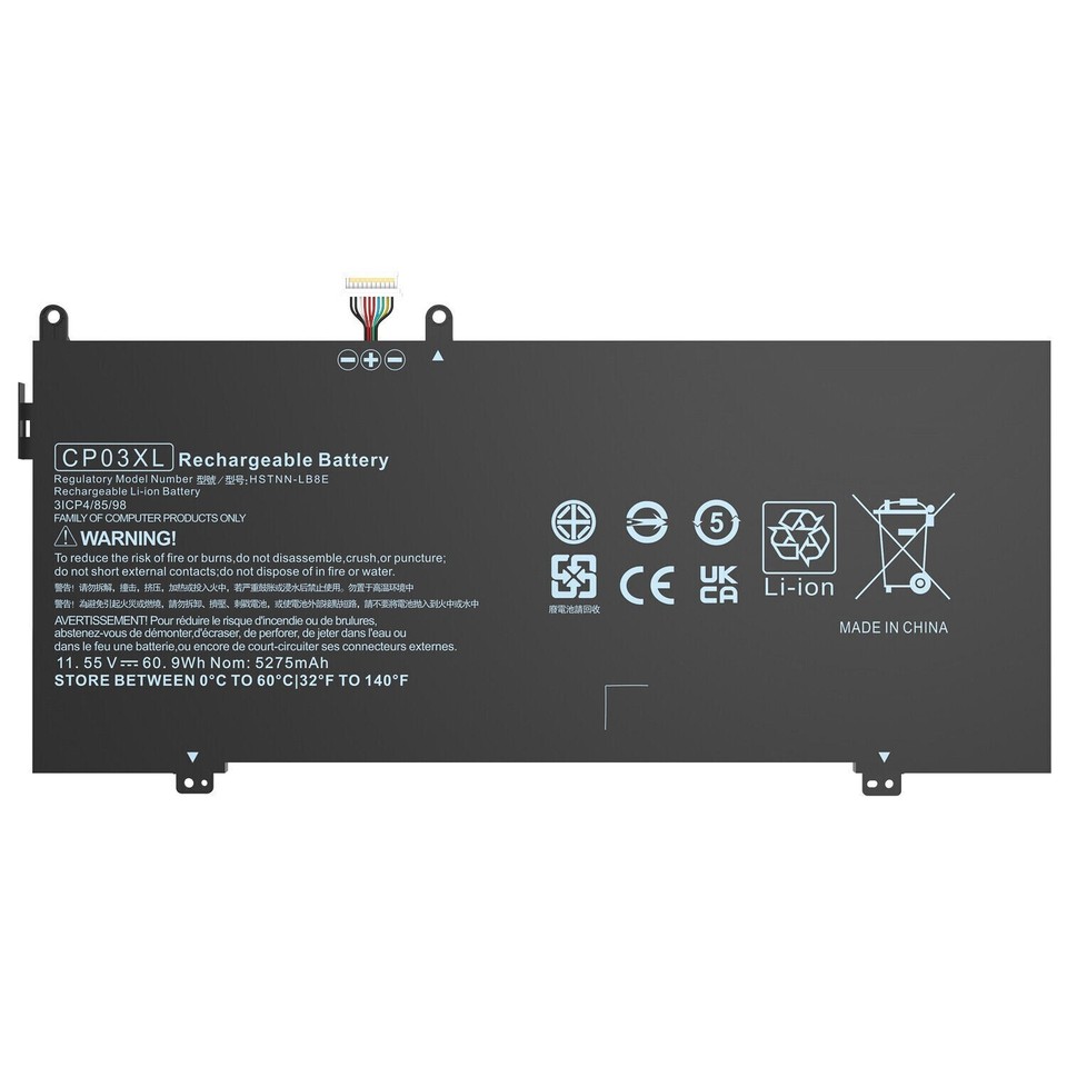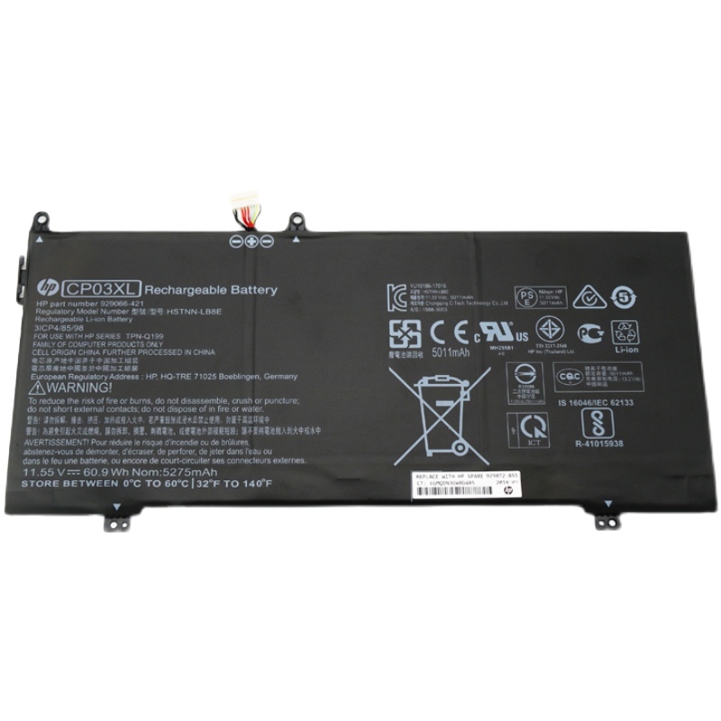 The HP CP03XL battery is a high-quality replacement battery for HP laptops, including the Spectre x360 13-ae049ng and 13-ae040ng models. It has a capacity of 5275mAh/60.9Wh and operates at 11.55V.