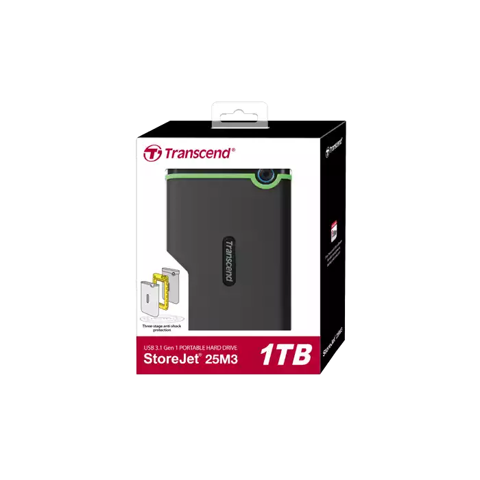 The Transcend StoreJet 25M3 1TB Portable External HDD (TS1TSJ25M3S) is a ruggedized external hard drive designed for reliable data storage and fast file transfers. It features the USB 3.1 Gen 1 interface, which supports transfer rates of up to 5Gbps, ensuring quick data transfer speeds.